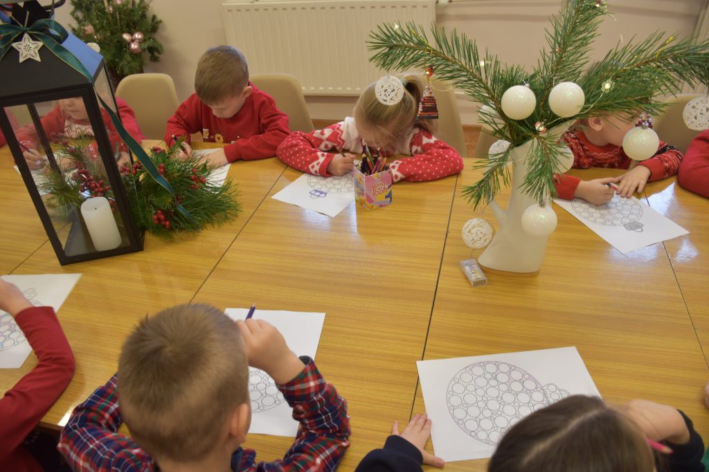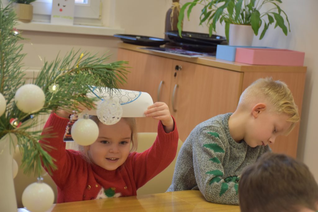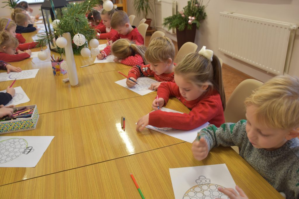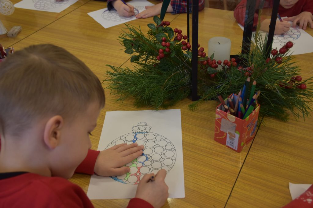 Po wspólnym czytaniu dzieci przystąpiły do pracy plastycznej – przygotowały własne bombki, które ozdabiały kolorową plasteliną. Powstały wyjątkowe, niepowtarzalne dekoracje, pełne dziecięcej wyobraźni i świątecznego klimatu ![]()