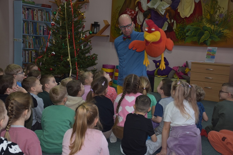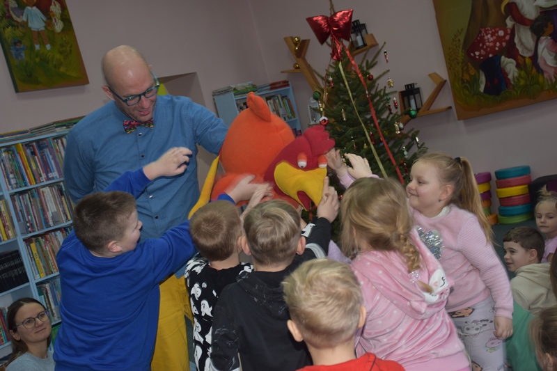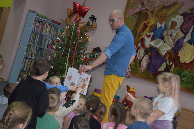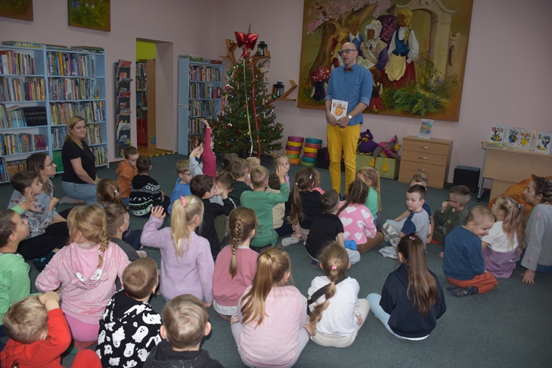 Po noworocznej przerwie sępoleńską bibliotekę odwiedziły Motylki z Gminnego Przedszkolna nr 2 „Bajka” oraz Jeżyki z Gminnego Przedszkola nr 3, aby wspólnie uczestniczyć w wyjątkowym spotkaniu z Panem Poetą – autorem książek dla dzieci. Nasz gość czytał dzieciom swoje wierszowane historie o kurze, kaczce i pawiu, które nie tylko bawiły, ale zachęcały do aktywnego uczestnictwa.