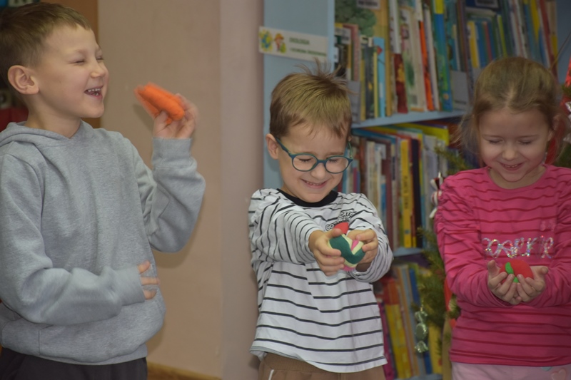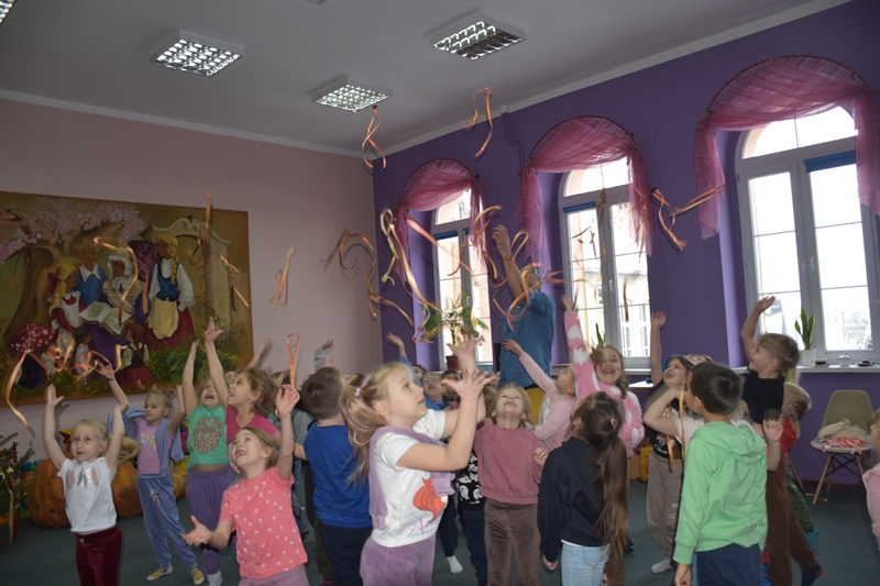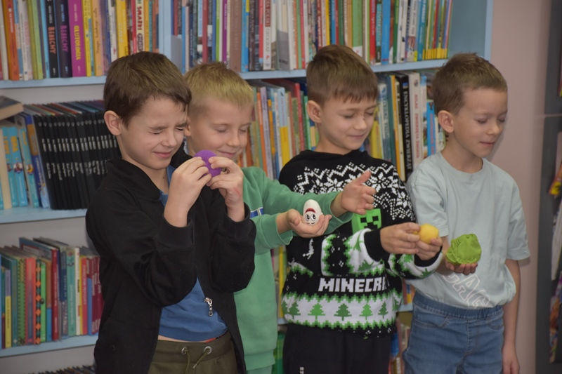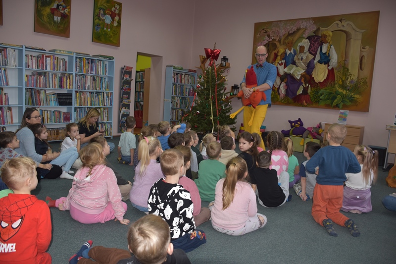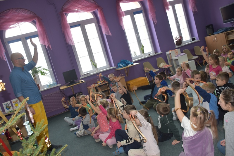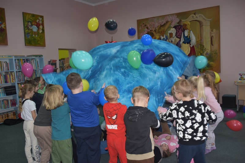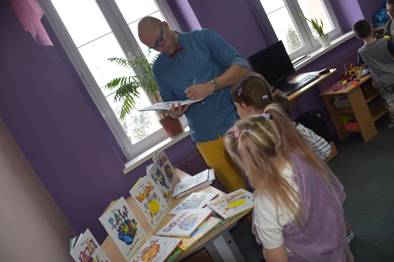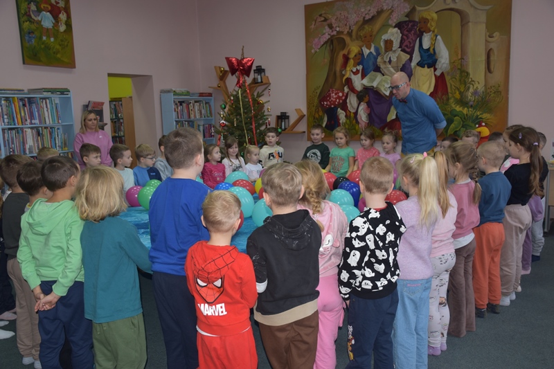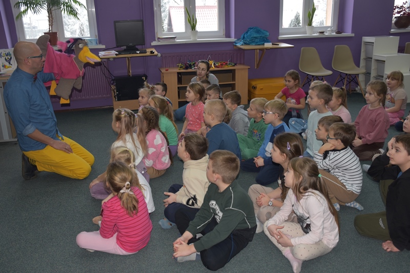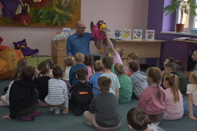 Po każdej opowieści Pan Poeta zapraszał dzieci do wesołych zabaw tematycznie związanych z przeczytanymi historiami – pacynki, kolorowe rekwizyty i ruchowe zadania sprawiły, że spotkanie było pełne śmiechu i dobrej energii. Dzięki temu mali czytelnicy mogli przekonać się, jak wiele radości daje wspólne czytanie i zabawa z książką.