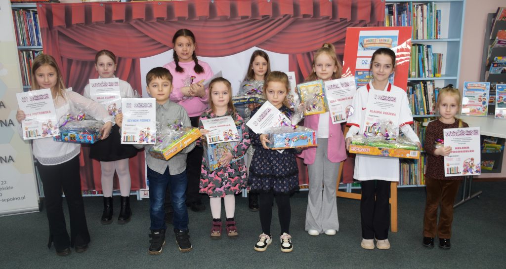 02.03.2026 r. w naszej bibliotece odbyło się uroczyste wręczenie nagród w powiatowych konkursach „Wierszykarnia” oraz „Mistrz Pięknego Czytania”, w których udział wzięło 70 uczniów z różnych szkół powiatu. Poziom prezentacji z roku na rok jest coraz lepszy. W pierwszym z konkursów uczestnicy nagrywali recytacje wierszy o tematyce sportu i aktywności fizycznej, natomiast w drugim przygotowywali krótkie nagrania głośnego czytania fragmentów wybranych książek związanych ze sportem. Jury w składzie: Hanna Gerth, Agnieszka Giersz-Kawka, Grażyna Guguła, Joanna Łangowska oraz Lucyna Welka wyróżniło następujące osoby:
