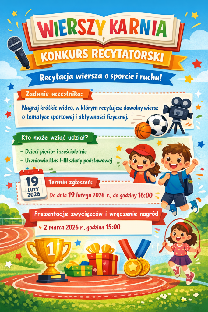 Zapraszamy uczniów klas I-III SP oraz dzieci pięcio  i sześcioletnie do udziału  w kolejnej edycji powiatowego konkursu recytatorskiego pt. „Wierszykarnia”.