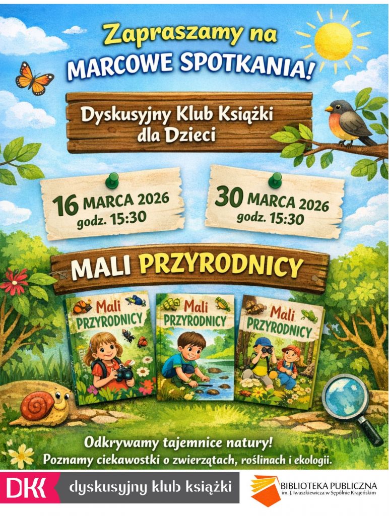 📚 Zapraszamy na marcowe spotkania Dyskusyjnego Klubu Książki dla Dzieci! 🌿 W marcu spotykamy się dwa razy: 16.03.2026 i 30.03.2026 o godzinie 15:30 w sępoleńskiej bibliotece. Podczas spotkań omówimy serię popularnonaukową „Mali Przyrodnicy” – książki, które w przystępny sposób pokazują dzieciom fascynujący świat przyrody. Dowiemy się z nich, jak rosną rośliny, jakie zwyczaje mają zwierzęta ... Zaproszenie na spotkanie
